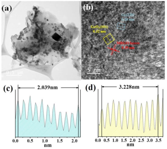 Figure 3 shows the SEM images of the (a, b) Ge/GeO2 NPs and (c, d) Ge/GeO2/MRGO. As shown in Figure 3a,b, the Ge/GeO2 NPs agglomerated very densely, existing in the form of secondary particles. These agglomerated particles are separated into primary particles through ultrasonic treatment to form a composite with the graphene sheets, as shown in Figure 3c,d. Figure 3c,d shows the perfectly composited structure in which particles are evenly and closely embedded on the surface of the graphene sheets. In addition, for Ge/GeO2/MRGO, the multi-stacked graphene sheets show a bent and wrinkled shape, which is attributed to the effect of microwave treatment. On the other hand, chemically synthesized RGO showed smooth surfaces as seen in the SEM image (Figure S1 Supplementary Materials). Since the overall morphology of the samples was confirmed by SEM, HR-TEM provided more detailed information on the composite material. Figure 4 shows the TEM images of Ge/GeO2/MRGO. It is known that conventionally synthesized RGO consists of thin layers, as seen in the TEM image (Figure S1 in Supplementary Materials). Figure 4a shows the wide plate-shaped thin sheets with particles that were arranged in a disorderly fashion. Furthermore, at high magnification, multiple layers of the 2-dimensional material and the lattice fringe of the crystalline particles can be observed (Figure 4b). Figure 4c,d correspond to the (220) and (101) lattice planes of Ge and GeO2, which have d spacings of 0.20 nm and 0.32 nm, respectively. It is worth noting that the layers of the microwave-treated GO (MRGO) in the composite have an interlayer spacing of 0.39 nm. Such an increased basal spacing of MRGO in the composite could be expected to enhance ionic transport during charge/discharge reactions. Consequently, by measuring the brightness profile and calculating the interlayer distances in the image at high magnification, we confirmed that Ge/GeO2 NPs were homogeneously distributed onto MRGO to form the Ge/GeO2/MRGO composite.