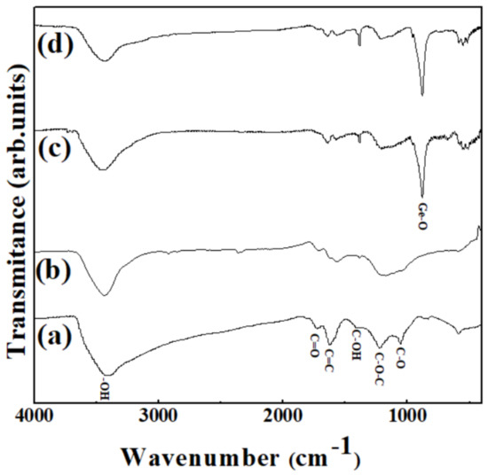 Fourier transform infrared (FT-IR) spectra of (a) GO, (b) MRGO, (c) Ge/GeO2/GO, and (d) Ge/GeO2/MRGO.