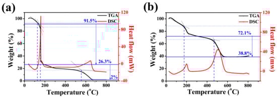 Thermogravimetric analysis (TGA) and differential scanning calorimetry (DSC) curves of (a) GO and (b) Ge/GeO2/MRGO.