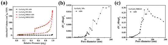 (a) N2 adsorption–desorption isotherms and the corresponding pore-size distributions of (b) Ge/GeO2 NPs and (c) Ge/GeO2/MRGO.