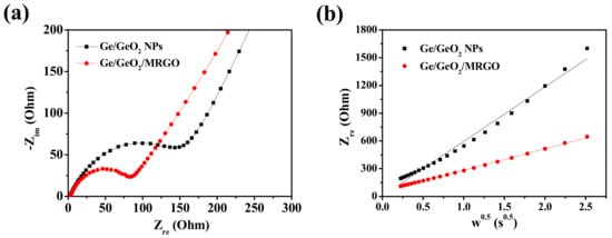 To understand the effect on compositing Ge/GeO2 particles with carbon nanosheets, the EIS spectra of the Ge/GeO2 NPs and Ge/GeO2/MRGO electrodes were examined. Figure 8 shows the Nyquist plots, composed of a depressed semicircle in the high-frequency region and Warburg plots, followed by a straight line at a low-frequency region. Each plot above is related to the charge-transfer resistance and Li-ion diffusion behavior. When comparing the diameter of semicircles shown in Figure 8a, compared to that for the Ge/GeO2 NPs, the Ge/GeO2/MRGO anode exhibits a much smaller semicircle. This implies that the Ge/GeO2/MRGO electrode has significantly higher electrical conductivity than that of the bare Ge/GeO2 particles. Also, the equivalent circuit model and the fitting parameters of EIS data obtained were shown in Figure S3 and Table S1 (Supplementary Materials). The equivalent circuit consists of cell components and electrolyte resistance (Rs), surface film resistance (Rf), charge-transfer resistance (Rct), constant phase element (CPE), and Warburg impedance (W). The Rf and the Rct values of the Ge/GeO2/MRGO electrode (18.33 and 52.5 Ω) were much smaller than those of Ge/GeO2 NPs (28.9 and 101.1 Ω), clarifying the superior electrical conductivity of Ge/GeO2/MRGO. Additionally, the low-frequency region of EIS data is the Warburg plot (Figure 8b), in which the slope of this plot (the real part of the impedance curve in Figure 8a vs. the inverse square root of the angular frequency in the Warburg region) is an indicator of ionic conductivity []. As this slope decreases, the ionic conductivity increases. The observed slopes in Figure 8b clearly highlighted that the ionic conductivity of Ge/GeO2/MRGO was much higher than that of the bare Ge/GeO2 NPs. These results indicate that the introduction of Ge/GeO2 NPs into the matrices of MRGO not only provided more facile charge transport but also enhanced the ion conductivity through hybridization. Moreover, as expected in HR-TEM analysis, microwave treatment can lead to the large basal spacing of MRGO, which is profitable for Li-ion diffusion.
