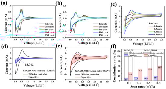 In this power-law relationship, both a and b are the adjacent parameters. Herein, parameter b corresponds to the slope in the linear equation above (Equation (4)) and has a value between 0.5 and 1. The typical battery-type anode materials, which are highly influenced by the diffusion-controlled process, have a b value close to 0.5, and the b value of the pseudocapacitive electrode is close to 1 [,,,]. Figure 9c shows the CV curves of Ge/GeO2/MRGO at different scan rates (0.1, 0.3, 0.5, and 0.8 mV/s), and the dependence of the b value, which was obtained from the cathodic and anodic sweeps, are shown in Figure S4 (Supplementary Materials). For Ge/GeO2/MRGO, b values of 0.72 and 0.85, relatively close to 1 on average, were determined for the cathodic and anodic scan, respectively, indicating that the contribution of the surface-controlled process to the Li-ion storage mechanism was more dominant than that of the diffusion-controlled storage mechanism. A more quantitative comparison of the contribution of the diffusion-control and capacitive processes is shown in Figure 9d–f. For the Ge/GeO2 NP electrode containing Ge, which is well known to follow the alloying–dealloying mechanism and GeO2 conversion reaction, it has been demonstrated that there is little influence by a capacitance of ~18.7%, at a scan rate of 0.8 mV/s. Contrarily, for the nanocomposite to which the conductive MRGO was incorporated, it could be observed that the expressed capacity contributed by the pseudocapacitive contribution increased significantly to 58.8% at the same scan speed.