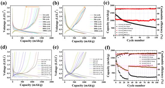 Charge/discharge curves of (a) Ge/GeO2 NPs and (b) Ge/GeO2/MRGO (at a current density of 100 mA/g), and (c) their cycling performances. Charge/discharge curves of (d) Ge/GeO2 NPs and (e) Ge/GeO2/MRGO at current densities of 100, 300, 500, 700, 900, and 1000 mA/g for 5 successive cycles (after 30 cycles the current density was reverted back to 100 mA/g), and (f) their cycling performance and rate capability.