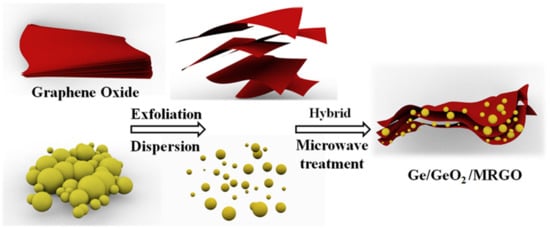 Ge generally stores Li ions through an alloying mechanism (1) [,,,], which yields Li22Ge5 in a fully charged state. Meanwhile, GeO2 undergoes conversion (2) before generating the Li–Ge alloy [,,,]. However, as the alloying-dealloying reaction proceeds, the conversion of GeO2 is irreversible, due to the formation of a Li+ inactive phase (LiO2) that could result in a decrease in the Coulombic efficiency (CE) []. This decreases the maximum expression of the theoretical capacity of GeO2 (2152 mAh/g) by half. Despite this limitation, its theoretical capacity remains high. On the other hand, the intrinsic drawback of Ge anode is that it generally undergoes a large volume expansion of 370% during the lithiation and delithiation process; this expansion has a tremendous impact on the stability of its electrodes. This large volume variation induces a crack and the consequent pulverization of the electrode in which the active material is physically separated from the current collector; this causes a severe decrease in the capacity of the Ge electrode for battery applications. To overcome such a demerit of Ge-containing anodes, a number of research attempts have been conducted by fabricating composites between carbonaceous materials and Ge-containing materials. For example, mesoporous Ge/GeO2/carbon composite with increase discharge capacity was prepared via self-assembly []. Recently, Ge/GeO2/carbon composite, prepared by carbon coating, also showed increased reversibility upon successive charge/discharge cycles []. The developed nanostructured pores in these Ge/GeO2/carbon composites could be utilized as buffered spaces to minimize volume expansion during charge/discharge, leading to the superior electrochemical lithium storage properties. In this regard, reduced graphene oxide (RGO) can be a promising alternative for preparing nanostructured composites with Ge/GeO2, since electrochemical and structural properties of RGO could be effectively controlled by choosing proper synthesis methods [,,].