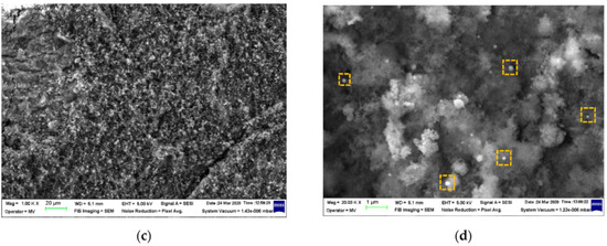 Although the QDs have a high tendency to aggregate, with the observed particles being closely packed, the TEM investigation confirmed the predominant spherical shape of QDs (Figure 1a—yellow dot circles). Further, their size was lower than 10 nm, with a noticeable crystallin silicon core covered by a fine shell (≤2 nm) of amorphous silica, as it was described before [19]. The EDXS analysis (Figure 1b) showed the presence of silicon and oxygen as part of the Si/SiO2 QDs structure, confirming the pure composition of Si/SiO2 particles, the carbon and copper content being part of the carbon holey copper grids used for TEM determinations. Taking into account the high degree of QDs aggregation, a SEM investigation of the aggregates’ surface topography was absolutely necessary for a further correlation with the impact on cells. The SEM image of 1000× magnification (Figure 1c) provided an overview of the QDs arrangement, with a very compact topography characterized by nano- and micro-roughness being obtained. A more detailed view on SEM (20,000× magnification) showed the presence of individualized spherical Si mono-crystals of nanometer sizes (Figure 1d—orange dot squares).