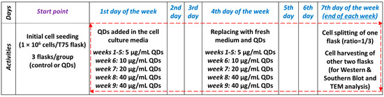 Schematic representation of the long-term exposure (9 weeks of 7 days each) of MRC-5 cells to Si/SiO2 QDs. The human lung fibroblasts were cultivated on three flasks of 75 cm2 per group (control or QDs) at an initial density of 1 × 106 cells/flask (“Start point”). The QDs were added in the culture media at 24 h after each seeding (“1st day of the week”) in order to maintain a proper cell adhesion on the flasks’ surface. When culture medium was changed (“4th day of the week”), the QDs were added again in the fresh culture media. The passage of cells cultured in one flask was performed at the 7th day of the week (“the end of each week”), the split ratio being 1/3. The cells from the other 2 flasks were collected for Western and Southern blots and for TEM analysis.
