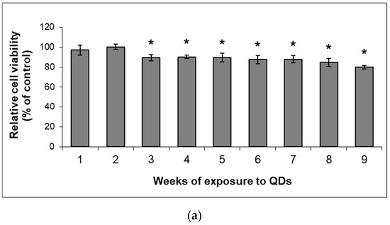 In order to determine how cell proliferation was affected by QDs exposure, the MTT test was performed. It was found that long-term exposure to QDs did not induce a significant decrease in cell viability. A decrease of no more than 5% of control was observed after the incubation with a concentration of 5 µg/mL QDs, and no more than 20% for subsequent concentrations (Figure 3a).