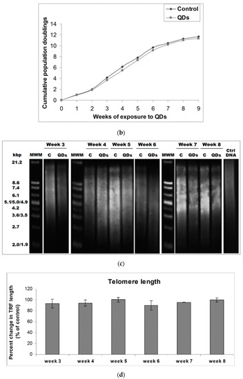 To track the influence of QDs on proliferative capacity and on the induction of replicative senescence in MRC-5 cells, the telomeric fragments were detected and their lengths were quantified by Southern blot using the TeloTAGGG Telomere Length kit (Figure 3c,d). A key factor considered in this study was the number of population doublings, as the telomeric sequence is known to shorten with each cell replication. Thus, after a certain number of population doublings, adult cells reach the Hayflick limit, the threshold at which they no longer replicate and enter senescence [24]. MRC-5 cells can achieve an average of 50 population doublings until the Hayflick limit is reached [25]. In this way, it can be observed that a shortening of telomeres in the control cells in the last 3 weeks occurs (Figure 3d), which corresponded to a lower replication rate highlighted by the phase plateau of the growth curve in the last weeks of the experiment (Figure 3b). Compared to the control, the highest decrease during the whole period of incubation with QDs was by 10% after the sixth week, suggesting that the concentrations tested did not affect the length of telomeres in MRC-5 cells. Further, no changes were obtained after week 9 compared to the previous one (data not shown).