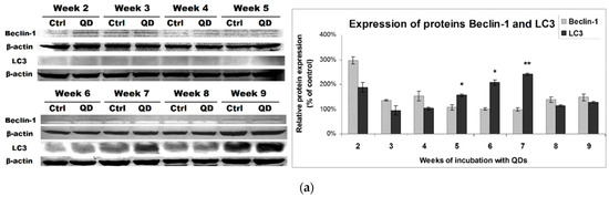 Regarding autophagy, it is known that by the accumulation of autophagosomes and autophagic substrates, NPs can induce cell death due to unsustainable accumulation of autophagic vacuoles [28]. To investigate the ability of QDs to induce autophagy in MRC-5 cells during long-term exposure, the protein expression of Beclin-1 and LC3 was quantified (Figure 5a). Beclin-1 is a component of the phagophore nuclear complex involved in the early stages of autophagosome synthesis [29], while the LC3 protein is conjugated to phosphatidylethanolamine consequently to autophagy induction and inserted into the formation of the autophagosome’s membrane [30]. The most important increase in the Beclin-1 level, almost 3-fold that of the control, was noticed after the second week of exposure to QDs. After that, the protein level was much closer to that of the control, with only an increase of 50% above the control after the fourth and ninth weeks. Regarding the dynamics of LC3 protein expression during the 9-week incubation with QDs, there was an initial increase after the second week, followed by a recovery to the control levels during the next two weeks. By increasing the concentration of QDs in the culture medium, the cells responded through a progressive elevation of LC3 expression during the fifth, sixth and seventh weeks, then a return to the control was observed after the last two weeks.