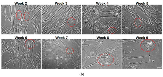 Analysis of MRC-5 fibroblasts’ morphology using the phase-contrast light microscopy (Figure 5b) showed a progressive accumulation of perinuclear distributed vacuoles. This observation is also revealed by TEM in Figure 4. Further, in the last two weeks of incubation, numerous vacuoles were visualized, which could determine the appearance of cellular lesions.