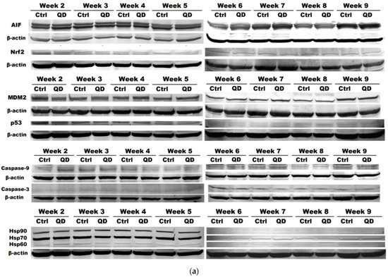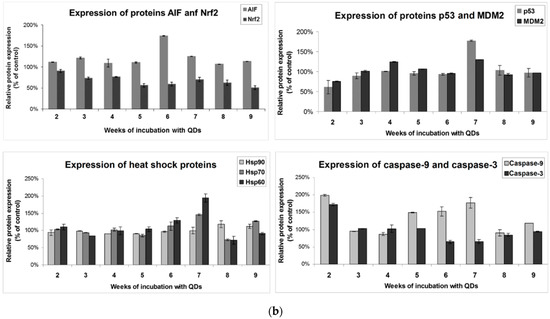 In this context, it can be assumed that the increased level of caspase-3 generated after the initial concentration of QDs stimulated an apoptotic response, suggested by the similar result obtained for the active form of caspase-9. The increased expression of caspase-9 after weeks 5–7 could be correlated with the profiles obtained for the p53 protein and its regulator, MDM2, but also with the expression of Hsp and the AIF protein. At the same time, it can be noted that during the same incubation period, high values of LC3 were reached, which could suggest a critical point in the long-term exposure of MRC-5 cells to the Si/SiO2 QDs. These results regarding the decrease expression of proteins after weeks 8 and 9 compared to week 7 could appear as a consequence of the cell response changes due to an increase in the concentration of administered QDs (40 µg/mL). This aspect could appear delayed in terms of cell viability (Figure 3a) that showed a total decrease by 20% of the control at the end of week 9 and a reduction by 8% compared to week 7.