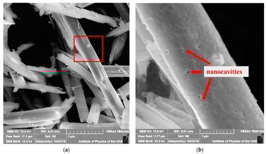 In Figure 4a,b are shown SEM images of a Cu/TiO2_650 sample at low and high magnifications, respectively. The layered morphology of the MRs and their length were preserved at annealing at 650 °C.