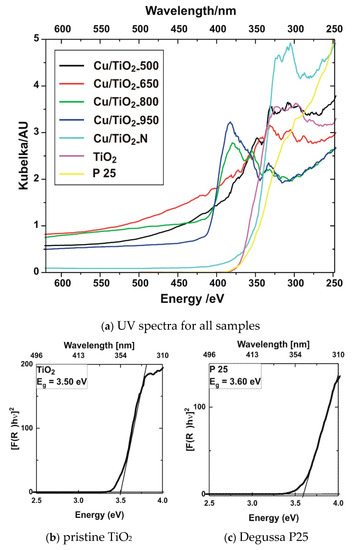 UV-visible studies and direct bandgap estimation of the Cu/TiO2_N, Cu/TiO2_500, Cu/TiO2_650, Cu/TiO2_800 and Cu/TiO2_950 materials are shown in Figure 13a–h. Also, the results of the pristine 1D TiO2 MRs prepared by the same method and standard TiO2-P25 are presented for comparison.