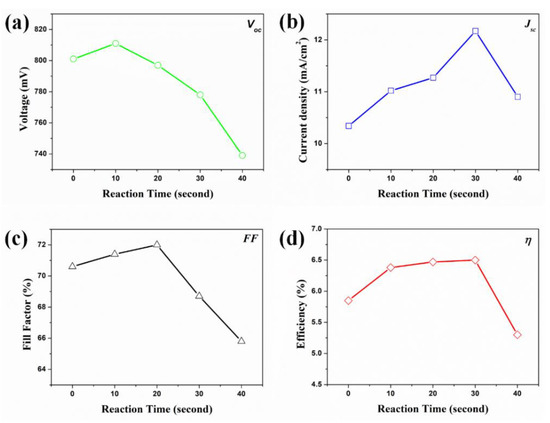 The photovoltaic properties of DSSCs based on f-TNTAs with Au NPs were measured under an AM 1.5, one-sun condition, and the results are shown in Figure 5 as open-circuit voltage (Voc) (a), short-circuit current density (Jsc) (b), fill factor (FF) (c), and power conversion efficiency (PCE, η) (d). These factors are summarized in Table 1. The amount of Au NPs depended on the reaction time. The plasmonics will distinguish the “charging effect” and “plasmonic effect” because the Au NPs have metal properties [21]. Electrons were trapped by Au NPs when relatively few Au NPs were decorated into the active layer of DSSCs. Thus, the electron density on the active layer increased, which affected the Fermi level. Consequently, the Voc and FF increased via the “charging effect.” When an optimized amount of Au NPs was decorated into the active layer of DSSCs, many electrons were generated by Au NPs due to the surface plasmon resonance (SPR) phenomenon, which affected the Jsc and FF via the “plasmonic effect.” As shown in Figure 5a, as the reaction time increased from 0 s to 40 s, the DSSC showed the highest Voc at 10 s due to the charging effect. As the reaction time increased, the Voc of the DSSC gradually decreased because of the recombination. As shown in Figure 5b, the Jsc gradually enhanced with increasing reaction time until 30 s, and it reached the highest Jsc at 30 s due to the plasmonic effect. In Figure 5c, DSSC had the highest FF at 20 s due to the synergy of the charging effect and plasmonic effect. The charging effect is related to Voc, the plasmonic effect is related to Jsc, and the electron density is related to FF. Thus, the electron density is determined by the charging effect and plasmonic effect. As shown in Figure 5d, the DSSC had a better PCE at 30 s in spite of a decrease in the Voc. In a DSSC with a 30 s reaction time, the electrons were recombined via Au NPs using the charging effect, but more electrons were generated by Au NPs via the plasmonic effect. Therefore, the net electron density on the active layer increased. Finally, the total PCE of the DSSC was higher than any other DSSCs at 30 s. As shown in Figure 5a–d, the DSSCs had low values of Voc, Jsc, FF, and PCE at 40 s. This is because the Au NPs were aggregated, making their main role active layer recombination. So, the electron density on the active layer decreased, resulting in the low Voc, Jsc, FF, and PCE.