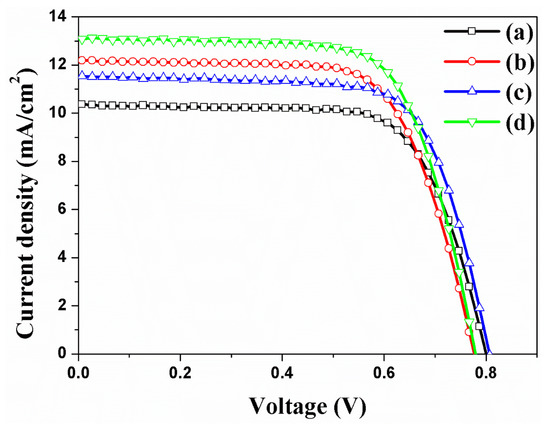 Figure 6. I–V curves of DSSCs based on the f-TNTAs: (a) without both Au NPs and a scattering layer, (b) with Au NPs, (c) with a scattering layer, and (d) with Au NPs and a scattering layer.