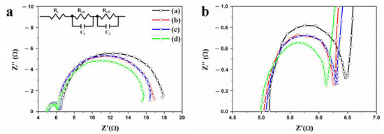 Electrochemical impedance spectroscopy (EIS) was used to measure the resistances to confirm the effect of Au NPs and a scattering layer in DSSCs. The impedance spectrum of a DSSC based on f-TNTAs with Au NPs and a scattering layer is shown in Figure 7. The fit parameters of the impedance properties are summarized in Table 3, and they contain Rs, R1, and R2. Each spectrum contains two differently sized semicircles. Rs is the series resistance of DSSCs whose starting point is semicircles on the x-axis. As the current density (Jsc) of DSSCs increased by improving charge transport, the series resistance Rs decreased. The Jsc values of DSSCs based on f-TNTAs: (a) without Au NPs and without a scattering layer, (b) with Au NPs, (c) with a scattering layer, and (d) with Au NPs and a scattering layer were 10.34, 12.17, 11.56, and 13.10 mA/cm2, corresponding to Rs values of 5.099, 5.039, 5.059, and 4.942 Ω, respectively. The increased charge transport increases Jsc, which also decreases Rs in DSSCs. R1 is the sum of the small semicircle at high frequency, which represents the interfacial resistance of FTO/f-TNTAs and Pt/electrodes in DSSCs as shown in Figure 7 (b). The interfacial resistance (R1) values of FTO/f-TNTAs and Pt/electrodes in DSSCs: (a) without Au NPs and without a scattering layer, (b) with Au NPs, (c) with a scattering layer, and (d) with Au NPs and a scattering layer were 1.257, 1.088, 1.098, and 1.071 Ω. In DSSCs with Au NPs and/or a scattering layer, more electrons were generated by plasmonics and light harvesting, which decreased the interfacial resistance of FTO/f-TNTAs. R2 is the sum of large semicircles at low frequency, which represents the interfacial resistance of f-TNTAs/electrolyte and electron transport or transfer resistance of f-TNTAs. The R2 values of DSSCs: (a) without Au NPs and without a scattering layer, (b) with Au NPs, (c) with a scattering layer, and (d) with Au NPs and a scattering layer were 12.77, 11.68, 11.75, and 10.98 Ω, respectively. More electrons were generated by plasmonics in DSSCs with Au NPs or/and a scattering layer, and light harvesting that improved the electron transport or transfer on f-TNTAs in DSSCs. Electrochemical impedance data showed that the electron generation and light harvesting ability were improved by the introduction of Au NPs and a scattering layer in DSSCs.