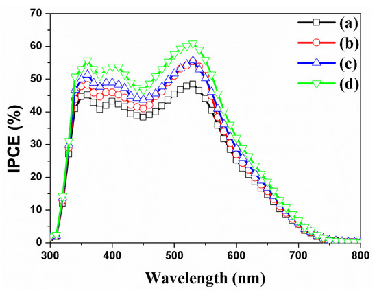 Incident photon to electron conversion efficiency (IPCE) data were obtained for DSSCs with/without Au NPs and TiO2 scattering layers. DSSCs without Au NPs and a scattering layer showed absorption bands of N719 dye at 393 and 533 nm as shown in Figure 8 (a). After the Au NPs were decorated into the f-TNTAs in a DSSC as shown in Figure 8 (b), the IPCE data showed an increase at 530 nm compared to DSSCs without Au NPs and a scattering layer. This is because the current density of the DSSCs with Au NPs was increased by the plasmonics at 530 nm. The UV-vis spectra confirmed that introducing Au NPs resulted in some special extinction at 530 nm. After the scattering layer was introduced on the f-TNTAs in the DSSC, as shown in Figure 8 (c), the IPCE data showed a uniform increase from 390 to 530 nm. This is different from the case in which Au NPs were decorated into the f-TNTAs shown in Figure 8 (b) because the current density of the DSSCs with a scattering layer increased due to light harvesting. Finally, after both Au NPs and a scattering layers were introduced in DSSCs, Figure 8 (d), the IPCE data showed much better efficiency than any other results due to the plasmonics and light harvesting.