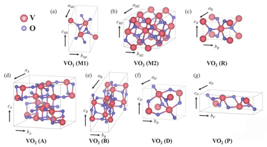 At present, several phases of VO2 have been reported, including VO2 (M) (P 21/c), VO2 (R) (P 42/mnm), VO2 (A) (P 42/nmc), VO2 (B) (C 2/m), VO2 (C) (I 4/mmm), VO2 (D) (P 2/c) and VO2 (P) (Pbnm), as shown in Table 1 [21,22,23,24,25,26,27,28,29,30]. Additionally, the corresponding crystal structures are displayed in Figure 1. Under certain conditions, these phases can be transformed into each other (Figure 2) [25,26,31,32,33].