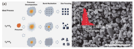 (a) The schematic illustration of growth of VO2 nanoparticles (NPs) under the ideal “heating-up” process and under the situations of rd ≪ rg and rd ≫ rg. (b) SEM image of grown VO2 (M) NPs; the inset in (b) shows the size distribution profile from more than 300 particles. Reproduced from [50], with the permission from Royal Society of Chemistry, 2014.