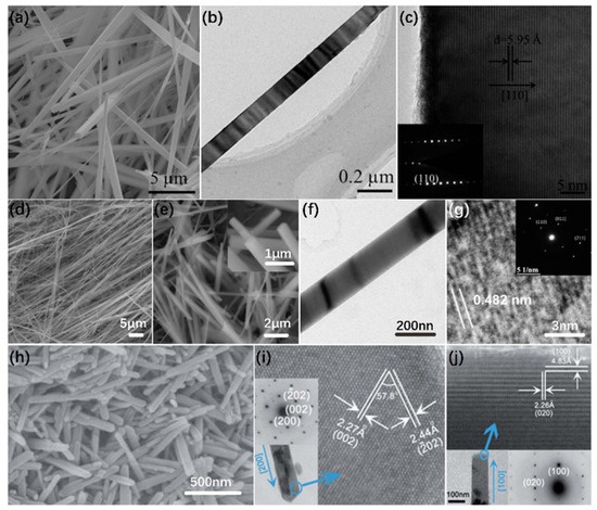 (a) SEM image of the VO2 (A) nanowires (NWs) and (b) low-resolution TEM image of individual VO2 (A) NW. (c) HRTEM image of the end of the VO2 (A) NW, and the inset is the corresponding SAED pattern. Reproduced from [29], with permission from Royal Society of Chemistry, 2014. (d) SEM image of V3O7·H2O NWs. (e) SEM image of monoclinic VO2 (M) NWs; the inset in (e) indicates rectangular cross-sections of VO2 (M) NWs. (f) TEM image of a monoclinic VO2 (M) NW. (g) HRTEM image of a monoclinic M1 phase VO2 NW; the inset in (d) shows the corresponding SAED pattern. Reproduced from [33], with permission from American Chemical Society, 2014. (h) SEM image of VO2 (M) NRs. (i,j) HRTEM images and SAED patterns of two individual VO2 (M) nanorods (NRs); insets are their corresponding SAED patterns and the morphologies of the selected NRs. Reproduced from [54], with permission from Royal Society of Chemistry, 2011.