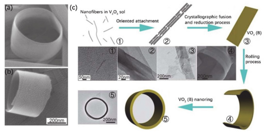 (a,b) SEM images of a single VO2 (B) nanoring viewed from different directions. (c) Schematic diagrams of the formation processes of VO2 (B) nanorings. Reproduced from [64], with permission from Royal Society of Chemistry, 2011.