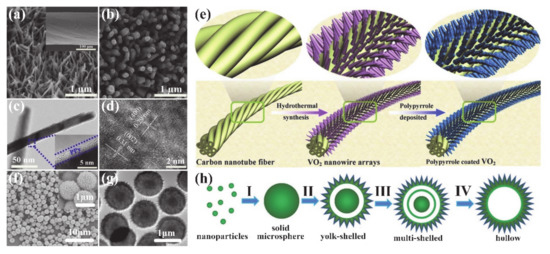 In addition to the structures described above, some special structures, e.g., NW arrays (NWAs) and hollow microspheres, have been successfully fabricated by the hydrothermal method [66,67]. Man et al. [66] fabricated a fiber-shaped asymmetric supercapacitor (FASC) by growing aligned three-dimensional (3D) VO2@polypyrrole (VO2@PPy) core-shell NWAs on carbon nanotube fibers (CNTFs). Precursor solution and CNTF were placed together in an autoclave. The autoclave was then sealed and heated to 180 °C for 24 h. After the reaction was completed and the system was cooled to room temperature, the CNTFs covered with VO2 NWAs were removed and dried at 60 °C for 12 h. Finally, the VO2@PPy/CNTF cathode and a thin layer of nitrogen doped carbon coated vanadium nitride NWAs on CNTF anode were twisted together to form the all-solid-state FASC devices after drying. The schematic diagram of the fabrication process of the VO2@PPy/CNTF electrode is displayed in Figure 7e. Figure 7a shows that VO2 NWAs are aligned and densely distributed on the whole surface of the CNTF (inset of Figure 7a). Additionally, Figure 7b shows a SEM image of VO2@PPy NWAs. The TEM image in Figure 7c indicates that the VO2@PPy is a core-shell structure. VO2 NWA is continuously coated by a PPy thin shell with a thickness of 2–3 nm. In addition, HRTEM image in Figure 7d shows that the fringe spacings are about 0.29 and 0.31 nm, which correspond to the (400) and (002) planes of monoclinic VO2, respectively.