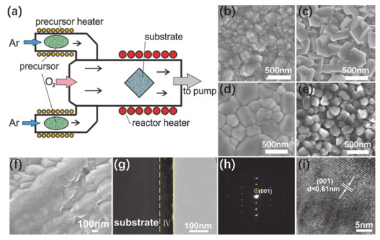 V(C2H7O)4, VOCl3, VCl4, VO(OC3H7)7 and V(C5H7O2)3 are usually used as source materials to synthesize VO2 by CVD method. Yakovkina et al. [75] prepared VO2 (M) thin film by metal–organic CVD (MOCVD). They used VO(acac)2-VO(C5H8O2)2 as the precursor and SiO2/Si(111) as the substrate. The flow rate ratio of argon/oxygen was controlled at 3–10 standard cubic centimeters per minute (sccm). The precursor source temperature was controlled in the range of 120–150 °C, and substrates were maintained at 390–490 °C, respectively. The whole growth process lasted for 30–120 min. The scheme of the CVD reactor for the growth of VO2 film is shown in Figure 8a. Compared with traditional CVD, MOCVD provides low temperature and low-pressure growth without post-growth annealing, and a shorter growth process. Sectional heating effectively avoided incomplete reactions of source materials. The morphologies of films with different grain sizes were obtained by adjusting the temperatures of the substrates, as shown in Figure 8b–e. The VO2 (B) phase mixed with the VO13 mesophase was obtained at low temperature (Figure 8b), and VO2 (M) monoclinic phase was obtained at a high temperature. CVD is a good way to synthesize not only pure phase VO2 (M) but also co-doped thin films. Guo et al. [76] reported Mo-Al-doped VO2 (B) thin films by CVD. V(C5H7O2)3 was employed as a V source mixed with Mo acetylacetonate ([CH3COCH=C(O)CH3]2MnO2) and Al acetylacetonate (Al(C5H7O2)3). The deposition processes were carried out in a three-zone furnace. The temperatures of precursor and substrate were 170 and 400 °C, respectively. The SEM image of Figure 8f shows large particles of Mo-Al-doped VO2 (B) thin films. The corresponding cross-sectional TEM images, SAED patterns and HRTEM images in Figure 8g–i indicate that the film is well crystallized along (001) direction.