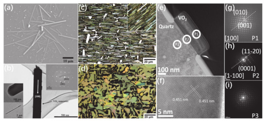 (a) SEM image of VO2 NWs. (b) TEM image of an individual VO2 NW. The insets are SEAD pattern and low-magnification TEM images of the growth front and the whole VO2 NW. Reproduced from [81], with permission from Elsevier, 2008. (c,d) The morphologies of the grown NWs and microplates. (e) TEM image of the cross-section of the interface between single NW and quartz substrate. (f) HRTEM image of VO2 NW. (g–i) The corresponding SAED patterns of the areas labelled with P1 (VO2), P2 (quartz), P3 (interface). Reproduced from [82], with permission from Springer Nature, 2014.