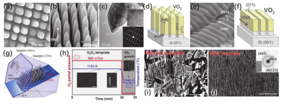 Up to now, most VO2 NWs have been randomly distributed on the substrates and show random sizes and varied directions during the synthesis process. Mutilin et al. [85] reported the growth of single crystal VO2 NW arrays on Si (001) substrates with controllable size, spacing and orientation. A large-area double nanoimprint lithography (NIL) technique was employed to obtain periodic gratings printed on a Si surface. Figure 12a,b shows the top- and side-view morphologies of the synthesized VO2-on-Si nanostructures. The TEM image and SAED pattern from Figure 12c demonstrate the smooth surface and monoclinic structure of VO2 NWs. Moreover, horizontal VO2 NWs or nanowalls were also observed in some regions, as illustrated in Figure 12e. The insufficiency of the presswork at the second NIL stage resulted in the strips on Si, and then those VO2 NWs or nanowalls were grown on Si strips. Figure 12d,f shows the schematic diagrams of arrays of VO2 NWs and nanowalls, respectively. In addition, Wang et al. [86] proposed a novel approach for growing vertical-arranged VO2 NW forests via defect engineering. The design schematics of the VO2 NWs hybrid material system are depicted in Figure 12g. Sapphire (Al2O3) has been chosen as the appropriate substrate for the growth of aligned VO2 arrays. The freestanding strain-free VOx compound can be obtained by using the r-plane sapphire substrate. Choosing r-sapphire can also ensure a high nucleation rate and denser VO2 NW arrays. In this work, they designed a two-step, self-templated growth of VO2 NWs using V2O5 as the precursor, as shown in Figure 12h. The two steps of growth were as follows: (i) V2O5 droplets were grown as a template on r-plane sapphire; (ii) VO2 NWs were separated out from droplets to form neatly arranged NWAs. In the first stage, the carrier gas with a certain oxygen/argon volume ratio was used to create an oxygen-enriched environment to prevent the formation of vanadium with reducing (+3 and +4) valences. Regarding the other aspect, a much higher temperature (1163 K) than the melting point of V2O5 was employed to prevent its large-scale growth without leaving a molten droplet of V2O5 on the substrate. At the second stage of the growth, oxygen supply was suddenly interrupted and growth temperature was slightly reduced, which provided a greater supersaturation for VO2 growth. During this stage, the V2O5 droplet was a natural template for VO2 growth, so that more atoms could be adsorbed and vertically-arranged VO2 NW forests could be fabricated. As a contrast, the pure argon was used as the carrier gas, a continuous deoxidation process occurred at high temperatures and the growth was carried out without template. Top views of grown VO2 NW arrays without and with V2O5 template and two-stage process are compared in Figure 12i,j. The density of NWs varies greatly, and the reduction of redundant growth in the plane can be easily identified. Additionally, the inset of Figure 12j shows a TEM image and the SAED pattern of a single VO2 NW.
