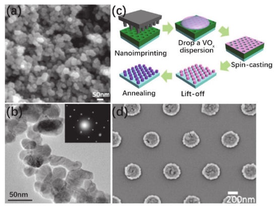 (a) SEM image of VO2 nanopowders and (b) TEM image of VO2 nanopowders; the inset is the SAED pattern of an individual particle. Reproduced from [106], with permission from Elsevier, 2011. (c) Schematic diagram of VO2 nanostructure fabricated by nanoimprint lithography. (d) SEM image of VO2 nanostructure arrays. Reproduced from [107], with permission from American Chemical Society, 2014.