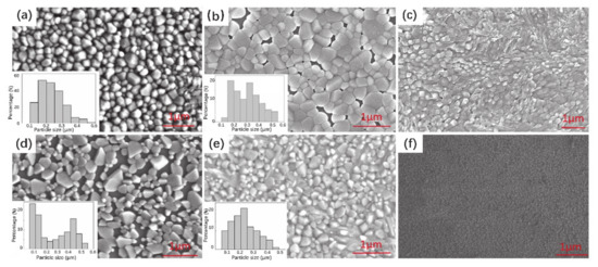 Magnetron sputtering began in the 1970s and developed rapidly because of its compatibility with microelectronic manufacturing technology [119,120]. In magnetron sputtering technology, incident ions (charged particles) obtain high energy under high-voltage electric fields in a vacuum and bombard the target surface. Target atoms get enough energy from the high-energy incident ions and escape from the target surface, and then deposit on the substrate to form a thin film. Differently from ordinary ion sputtering, the movement tracks of high-energy ions are controlled by a magnetic field, which can significantly promote the lifetime of incident ions and sputtering rate. Magnetron sputtering is a common technology for the preparation of thin films. Yu et al. [121] reported the fabrication of VO2 thin films with two steps. In the first step, pure vanadium thin films were deposited on a sapphire substrate by DC magnetron sputtering and then oxidized in a pure oxygen environment. Figure 16a–f displays the SEM images of the VO2 thin films with several oxidation conditions; the insets show the grain size distribution. Obviously, the oxidation conditions, e.g., temperature and oxygen flow rate, play important roles in the grain size, shape and arrangement [122].