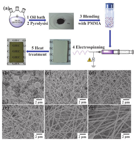 (a) Schematic diagram of the fabrication process of the VO2 film via electrospinning technique. (b–g) SEM images of the PMMA nanofibrous mats with different concentration (w/w): (b) 10%, (c) 12%, (d) 14%, (e) 16, (f) 18% and (g) 20%. Reproduced from [42], with permission from Elsevier, 2017.