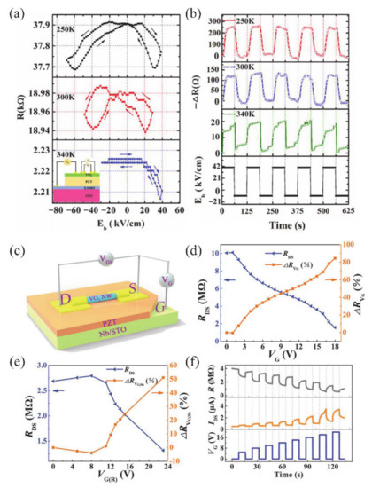 - Zhang, Y.; Xiong, W.; Chen, W.; Luo, X.; Zhang, X.; Zheng, Y. Nonvolatile ferroelectric field effect transistor based on vanadium dioxide nanowire with large on- and off- field resistance switching. Phys. Chem. Chem. Phys. 2020, 22, 4685–4691. [Google Scholar] [CrossRef] [PubMed]