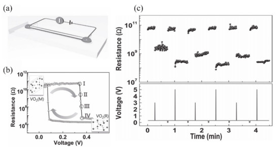 A phase transition is a sudden change of one phase to another under an external stimuli, e.g., a thermal field, strain energy, surface energy, an external force, a magnetic field, etc., accompanied by the significant change in physical properties. Metal–insulator transition (MIT) is one of the typical phase transition types in oxides, and has been a research hotspot in recent decades. Among inorganic materials with MIT, vanadium dioxide (VO2) is widely focused on because of the near-room-temperature phase transition temperature (Tc ≈ 340 K) and the reversible, huge changes in conductance and transmittance during MIT [1,2]. This reversible phase transition is a first-order phase transition, which is accompanied by a crystal structure change from a low-temperature monoclinic phase to a high-temperature rutile phase. Besides, the strongly correlated electron effect introduced by the special d electron orbit structure of VO2 leads to abundant interesting physical and chemical properties. Based on these excellent performances, VO2 can be widely used in many fields and has been becoming one of the hottest metal oxide materials in recent years [3,4,5,6,7,8,9]. Moreover, the rapid development in VO2 preparation and performance modulation technologies has greatly promoted the application of VO2 in many aspects; e.g., VO2 can be used as a channel layer of field-effect transistor (FET) due to its electric-field-adjustable MIT behavior. The distinctive hysteresis loop during the MIT process under an electric filed or temperature change leads to applications in memory devices; the great difference of transmittance between the insulating and metallic phases makes it a candidate material for smart windows; the strain and gas-environment-dependent MIT behavior holds promise for developing novel strain and gas sensors, etc., [6,10,11,12,13].