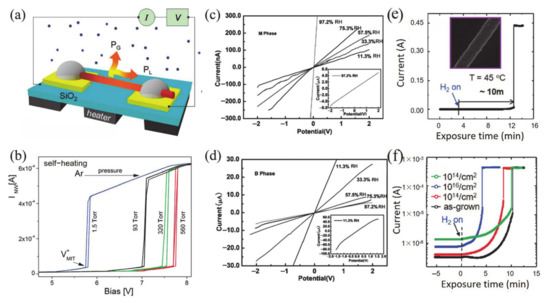 - Byon, J.W.; Kim, M.-B.; Kim, M.H.; Kim, S.Y.; Lee, S.H.; Lee, B.C.; Baik, J.M. Electrothermally induced highly responsive and highly selective vanadium oxide hydrogen sensor based on metal–insulator transition. J. Phys. Chem. C 2011, 116, 226–230. [Google Scholar] [CrossRef]