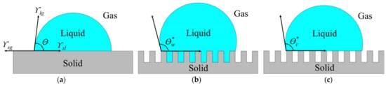 Basically, surface wettability is categorized by the contact angle of the liquid droplet [19,20]. Firstly, if the water contact angle (WCA) is smaller than 90°, a surface is considered hydrophilic. Secondly, if the WCA is greater than 90°, it is considered hydrophobic. Lastly, if the WCA is greater than 150°, it is considered superhydrophobic [21]. Typically, the contact angle of liquid droplets on a flat surface can be explained by Young’s model as shown in Figure 1a. However, a surface is never completely smooth and generally exhibits a surface roughness. The effect of surface roughness on the apparent contact angle of liquid droplets can be explained by the Wenzel and Cassie-Baxter models as shown in Figure 1b,c, respectively [22].