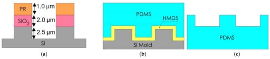 Cross-sectional schematic diagram (not to scale) of (a) PR/SiO2/Si patterning by conventional photolithography and plasma etching process (b) HMDS priming and PDMS casting by soft lithography process, and (c) peeled off PDMS sample from the Si master mold.