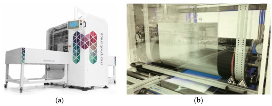 (a) Morphotonics’ automated Portis NIL600 tool (Morphotonics, Veldhoven, The Netherlands) and (b) set-up of a flexible stamp used for imprinting a substrate coated with UV-curable resin (Morphotonics, Veldhoven, The Netherlands) [47].