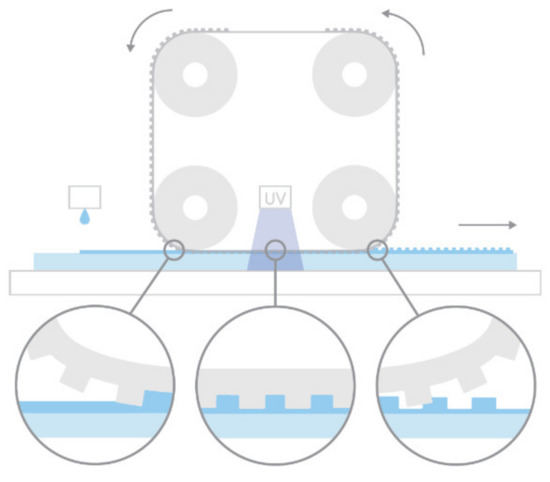 Schematic diagram of Morphotonics’ roll-to-plate ultraviolet nanoimprint lithography (R2P NIL) process (Morphotonics, Veldhoven, The Netherlands) [47].