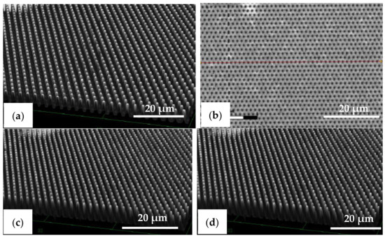 The difference between the replicated PIL and the C-RESS pattern heights (but also part of the observed deviations from the pattern design) can be explained by a different pattern depth on the Si master molds due to the earlier mentioned micro-loading and ARDE effects, which cause the Si etch rate to be dependent on the density and A.R. of the micro-structures [51,52,53]. Taking this into consideration, it may be that the actual pattern height fidelity of the C-RESS micro-structure replications are possibly even better and that the A.R. could be close to 5.0.