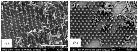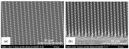 Typically, there are two ways to create a nature-inspired superhydrophobic surface with hierarchical micro-/nano-structured rough surface on a substrate with low surface energy: replication of a biological surface by a casting (i.e., soft lithography) process or an engineered rigid master template in a “top-down approach” photolithographic method. The soft lithography process is widely studied because it is easy and accurate to replicate the micro-/nano-patterns with various A.R. on the relatively soft PDMS substrate. However, the flexibility of PDMS (σ: 5.0 MPa, ε: 116% @RT) limits its feasibility in the processability of high A.R. structures and increasing pattern density, hydrophobicity, and mechanical strength. The challenges of using PDMS also include deformation, merging, and collapsing of structures, which result in decreased hydrophobicity [35].