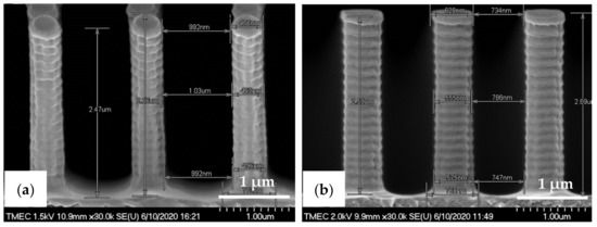 Cross-sectional view SEM images with corresponding measured dimensions of the PDMS micro-structures fabricated by soft lithography process before scratch test. (a) PDMS-PIL pattern (designed pattern size: diameter: 2.0 µm, height: 2.5 µm) and (b) PDMS-C-RESS pattern (designed pattern size: diameter: 1.0 µm, height: 2.5 µm).