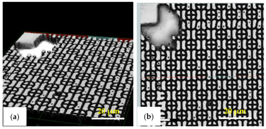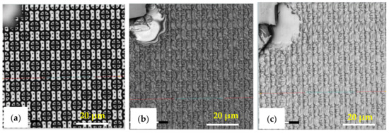 Here, the intermediate flexible stamp (not shown) used was made from the Si master mold after the in-house releasing agent treatment. Note that the artefact seen in the top left corner is part of the design on the Si master mold (see Figure 13a) and is, therefore, copied onto the samples. Detailed SEM imaging of the C-RESS-A and the C-RESS-B micro-structures before the scratch test further corroborate the abovementioned results and are shown in Figure 15a–c, respectively. Although the first two SEM images seem to presume that the replications were perfect and without defects, they are very local recordings of the patterned area. Moreover, a third SEM image shows indeed that many of the filled holes seem to be due to the breaking off of the pillars on the flexible stamp during delamination. Furthermore, no pattern mating, clumping or collapsing of the robust C-RESS micro-structure was found on the imprints as well as no air bubble defects. The cross-sectional SEM images in Figure 16a,b show that the pattern width (a) of the C-RESS-A (a: 1.52 ± 0.11 µm) and PIL-B patterns (a: 1.53 ± 0.04 µm) was practically the same and only deviating 1.3% and 2.0% from the original design, respectively.