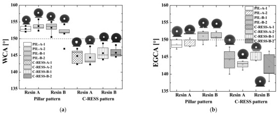Effects of micro-structure pattern and resin type on the contact angle of (a) water (WCA) and (b) ethylene glycol (EGCA) of the imprinted samples.