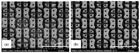 In this research, two different micro-structures, including a square-like pillar (PIL) pattern and circular rings with eight stripe supporters (C-RESS) pattern were designed as shown schematically in Figure 3a,b, respectively. These patterns were arranged in a square array. Si master molds of both the PIL and C-RESS micro-structure were fabricated by a conventional photolithography and deep reactive ion etching (DRIE) process [34,36]. In this experiment, the resolution of the lithographic exposure tool called Nikon stepper, model NSR2005i8A (Miyagi Nikon Precision Co., Ltd., Miyaki, Japan) is 0.5 µm. Therefore, the pattern was designed with a size (a) of 0.5 µm, a pattern spacing (b) of 0.5 µm, and a pattern height (h) of 2.5 µm. Hence, the A.R. of the PIL and C-RESS patterns were 5.0.
