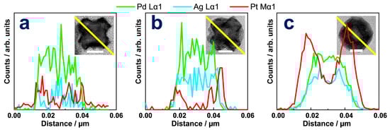 EDX line scanning profiles along the yellow line in the insets of (a) PdAgPt-CSC, (b) PdAgPt-CSHC, and (c) PdAgPt-THO. Scale bar in the insets: 10 nm.