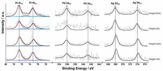 X-ray powder diffraction (XRD) patterns, as shown in Figure 5, further confirmed the fcc crystalline structures of all PdAgPt HMNCs. The diffraction peaks were located on the sites between pure Pd (PDF 46-1043) and Pt (PDF 04-0802), shifting to a larger angle than Ag (PDF 04-0783), which proved the two former metals were the major compositions. To a certain extent, the peak shifts in four XRD patterns were remarkably consistent with Vegard’s law. Despite the fact that XRD profiles reflected the alloy phase, the differences between atomic ratios detected by XPS and EDX confirmed the existence of heterogeneous nanostructures, as presented in Table 1. Because the XPS penetration depth was typically around 3 nm, the Pd 3d spectrum showed a doublet less clearly. On the whole, the chemical states of three metals in all PdAgPt existed predominantly as metallic states, as shown in Figure 6. The XPS binding energies of three metals are also listed in Table 1. Compared with the binding energies of the bulk metals (70.9 eV for Pt 4f7/2, 368.5 eV for Ag 3d5/2 [51] and 335.5 eV for Pd 3d5/2 [52]), the binding energies of Ag shifted lower and those of Pt and Pd higher for all PdAgPt HMNCs. These data suggested that the electronic structures were altered in PdAgPt HMNCs, specifically the electron densities of Pt were reduced.