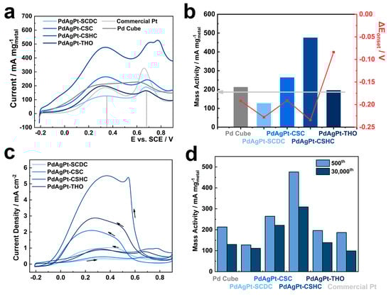 As a structure-sensitive electrocatalytic reaction, FAO was chosen to assess the electrochemical performance of as-prepared PdAgPt HMNCs, benchmarked against the original Pd cubes and a commercial Pt catalyst (average size: 10 nm). The specific electrochemically active surface areas (ECSAs) of PdAgPt HMNCs were estimated by accumulating the charge of the hydrogen adsorption/desorption area in the cyclic voltammetry (CV) curves obtained in N2-saturated HClO4 solution (0.1 mol L−1) (Figure S9). While the ECSA of the largest PdAgPt-THO was only 211.48 cm2 mg−1, around half of that of commercial Pt (437.15 cm2 mg−1), the value for PdAgPt-CSC and PdAgPt-CSHC reached 579.89 cm2 mg−1 and 538.63 cm2 mg−1, indicating the superiority of CSMNCS. To investigate the electrocatalytic properties of PdAgPt HMNCs, the metal mass-normalized CV curves toward FAO are given in Figure 10a, and part of the ECSA-normalized CV curves are shown in Figure 10c. There were generally two apparent peaks during the forward scan, which could refer to the direct oxidation pathway (FAO pathway a) and the indirect oxidation pathway (FAO pathway b), respectively [13,14,19,39,56]. Therefore, the current ratio between peak Ia and peak Ib is often employed to assess the dominant FAO pathway [57,58,59]. As depicted in Figure 10a, the two anodic peaks were centered at 0.349 V and 0.677 V for the commercial Pt, while the FAO on the Pd cubes presented one broad peak centered at about 0.25 V. During the 30,000 cycles of accelerated durability tests for FAO, the precise peak center positions of two FAO oxidation pathways for all electrocatalysts are listed in Table S1. Taking into consideration all the factors, the current densities at 0.35 V vs. SCE were applied as Ia, and current densities at 0.68 V vs. SCE were used as Ib for better comparison. The mass activities (Ia) in the direct oxidation pathway for all samples are shown in Figure 10b. Surprisingly, PdAgPt multi-metal nanocrystals with corner-satellite structures exhibited higher mass activities than Pd cubes (213.11 mA mg−1) after 500 accelerated cycles of FAO. The mass activities of PdAgPt-CSHC (475.99 mA mg−1) and PdAgPt-CSC (264.16 mA mg−1) were about 2.55 times and 1.42 times as large as that of commercial Pt (186.42 mA mg−1). Compared with other noble metal-based electrocatalyst reported before, the PdAgPt-CSHC also showed noteworthy superiority in direct FAO mass activity (Table S2). It verified the obviously enhanced catalytic activity of PdAgPt HMNCs with both corner satellites and hollow structures. The current ratios of Ia to Ib (1.09 for PdAgPt-CSC, 0.96 for PdAgPt-CSHC, and 0.60 for commercial Pt), in this condition displayed that the direct formic acid oxidation pathway of PdAgPt CSMNCs was highly promoted. Moreover, the onset oxidation potential of the FAO, Eonset, defined as the potential at which 10% of the Ia is reached, could also be used to evaluate the electrocatalytic performance. The shift values from the onset potential of commercial Pt, i.e., ΔEonset, are also depicted in Figure 10b. The onset potentials of all the PdAgPt HMNCs except PdAgPt-THO were close to that of Pd cubes, about 0.20 V negative to the Eonset of commercial Pt. Hence, it can be inferred that the special corner-satellite structures owed better electrocatalytic properties than normal heterogeneous structure. The reasons for the improvement of PdAgPt-CSHC sample are listed as follows. (i) The “third-body” effect: the indirect oxidation pathway preferred by Pt was suppressed, since active sites on the surface of corner satellites were reduced due to geometrical hindrance [27,60]. (ii) The electronic effect: because the electronic structure of Pt was altered in the heterogeneous nanostructure, the adsorption of HCOO* species was promoted, and the direct oxidation pathway of FAO was enhanced [9,16]. (iii) The synergetic effect: with the aid of Pd and Ag, Pt atoms showed enhanced catalytic activity toward FAO with higher proportion of the direct oxidation pathway, especially in hollow PdAgPt HMNCs.