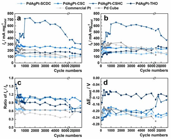 Heterogeneous shell of AgPt enormously improved the durability of whole nanocrystal in electrocatalysis. The electrocatalytic properties of all samples during 30,000 cycles of accelerated durability tests for FAO are shown in Figure 11. There is no doubt that the mass activities of both Pd cubes and commercial Pt dropped off markedly and steadily, during 30,000 cycles of accelerated CV measurements (Figure 10d). The retained mass activity Ia for commercial Pt was 98.67 mA mg−1, which was 53% of Ia in the 500th. As for PdAgPt HMNCs, from the analysis of electrocatalytic performance during 30,000 cycles, it may be inferred that the structures of PdAgPt-SCDC and PdAgPt-CSC were almost unchanged. The mass activity of PdAgPt-SCDC remained constantly low in the whole durability test, despite the fact that its onset potential kept close to that of Pd cubes. As well-defined AgPt corner satellites took shape in PdAgPt-CSC, the mass activity Ia after 30,000 cycles still reached 220.96 mA mg−1 (84%), showing greatly enhanced durability. The combination of corner satellites and hollow nanostructures in PdAgPt-CSHC achieved the highest direct FAO activity after 1000 cycles, which may have resulted from increasing active sites with the gradual loss of Ag. The high performance of PdAgPt-CSHC fell into decay after 10,000 cycles, the onset potential became less negative and the current ratio of Ia to Ib also descended from 0.9~1.2 to below 0.8 (Figure 11c,d). Still, its mass activity at 0.35 V after 30,000 cycles (308.78 mA mg−1) maintained 65% of the mass activity in the 500th cycle, about 3.13-fold of that of commercial Pt. One possible explanation is that the deformation of hollow nanostructures took place after the dissolution of Ag in the heterogeneous shell, as Ag resisted the dissolution of Pd/Pt. Moreover, Pt alloyed with Ag has been proved to exhibit higher tolerance to CO poisoning, which increases the CO resistance and thus durability of nanocatalysts [14,61]. After the dissolution of Ag, the electrocatalytic performance decay of PdAgPt samples was inevitable. Similar decay in electrocatalytic performance occurred in the other hollow structure (PdAgPt-THO), whose retained mass activity after 30,000 cycles amounted to 138.49 mA mg−1 (71%). Overall, PdAgPt HMNCs displayed better FAO durability than the original Pd cubes and commercial Pt. Therefore, by constructing the corner satellites with sacrificial Ag on sheltered Pd cores, Pt atoms fulfilled their essential role, and all precious metals could achieve higher utilization efficiency in a long-term way.