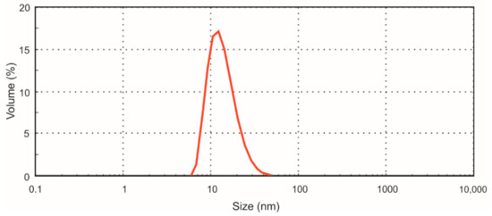 For the preparation of nisin-loaded particles, a nisin solution in water at the concentration of 10 μg/mL was added dropwise to the iron oxide nanoparticle solution (0.05 mg/mL) at the ratio 1/4 (v/v) under constant stirring at room temperature. The final concentration of nisin in the product was 2 μg/mL, and that of iron oxide nanoparticles in the solution was 0.04 mg/mL. For the preparation of control, instead of nisin solution, water was used. The solution of prepared nisin-loaded NPs was stored at +4 °C. Nisin loading on the particles was confirmed by Fourier transform infrared spectroscopy and thermogravimetric analysis. The diameter of nisin-loaded particles determined by atomic force microscopy and the hydrodynamic diameter determined by dynamic light scattering method was 11.3 ± 1.4 and 26.4 ± 2.0 nm, respectively [44]. The size distribution (hydrodynamic radius) of nisin-loaded particles is presented in Figure 2.